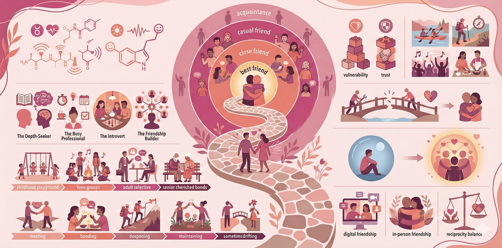 Visual representation of how friendships develop from acquaintances to lifelong bonds, showing the progression from surface-level connections to deep, reciprocal relationships.