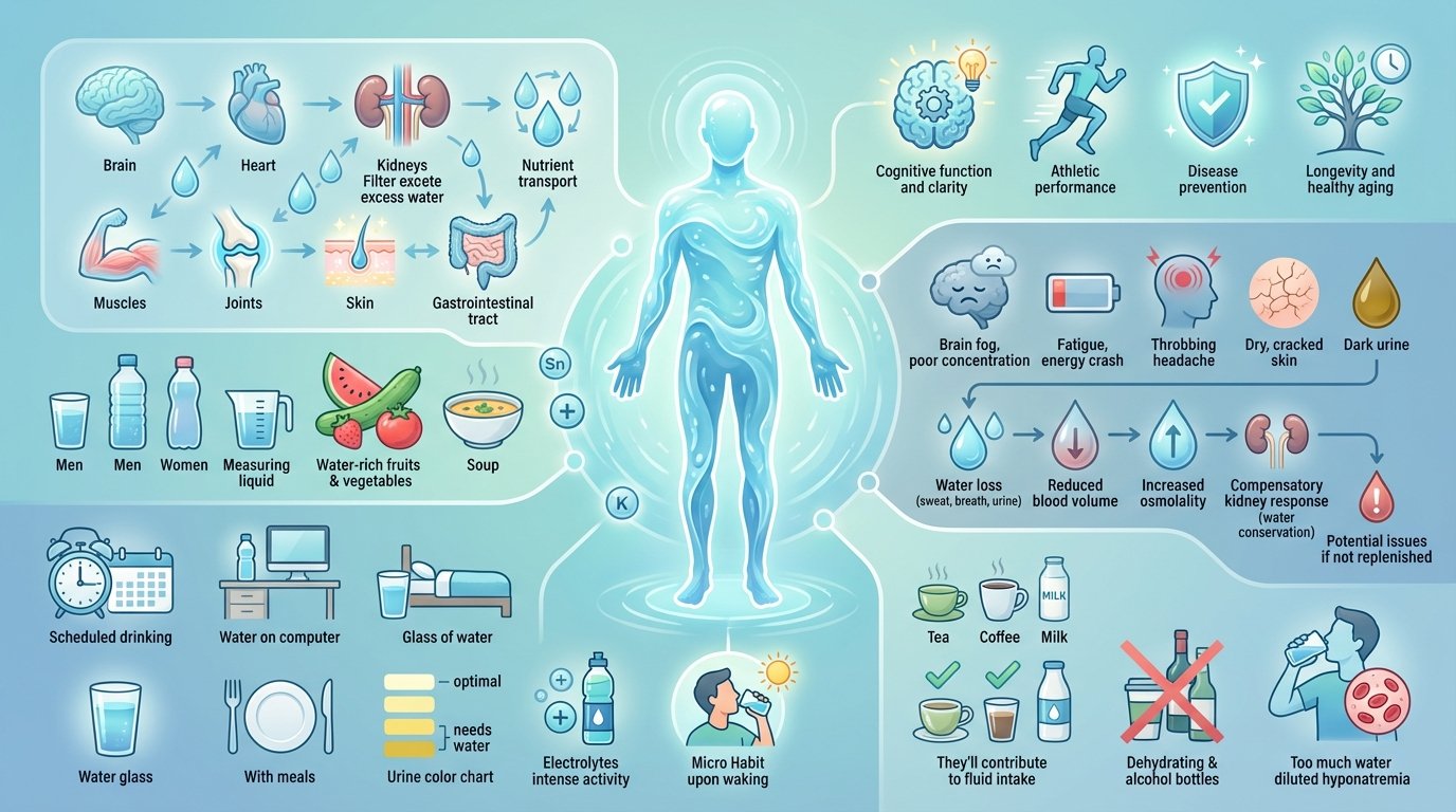 Your body is roughly 60% water, yet most of us struggle to drink enough throughout the day. That small percentage difference between optimal hidratación and mild dehydration can mean the difference between peak mental clarity and brain fog, between sustained energía and afternoon crashes, between glowing skin and persistent fatigue. Water isn't just another beverage you consume—es the fundamental medium through which every biological process in your body operates. From delivering oxygen to cells and regulating temperature to cushioning joints and supporting digestion, hidratación touches every aspect of your physical salud. Yet despite knowing water is essential, many people unknowingly drift through their days in a chronic state of mild dehydration, missing out on better focus, healthier skin, improved athletic rendimiento, and protection against preventable chronic diseases. The question isn't whether hidratación matters—it absolutely does. The real question is: are you getting enough?
