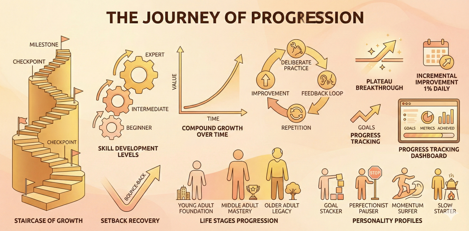 Progression is the forward movement toward your goals, marked by visible improvement and sustained momentum. It's not about reaching the destination instantly—it's about the steady climb that builds confidence, resilience, and happiness along the way. Research shows that experiencing progression activates reward centers in your brain, triggering dopamine release and creating a positive feedback loop that keeps you motivated. Whether in your career, health, relationships, or personal development, progression transforms abstract aspirations into concrete, measurable steps you can celebrate.