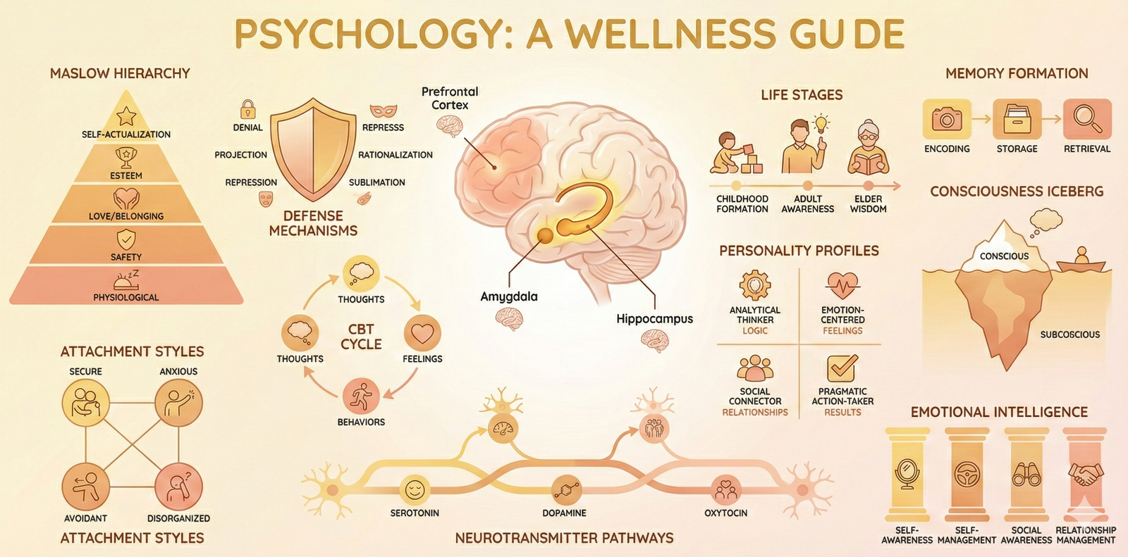 Psychology is the scientific study of human behavior, thought patterns, emotions, and mental processes. It examines how people think, feel, decide, and act—both as individuals and in social groups. The discipline draws from neurology, biology, sociology, and philosophy to create a comprehensive understanding of what makes us human. Modern psychology encompasses multiple approaches: clinical psychology addresses mental health treatment; cognitive psychology explores how we process information; positive psychology focuses on building wellbeing and human strengths; social psychology examines how we relate to others; and wellness psychology applies psychological science to create healthier, happier lives.