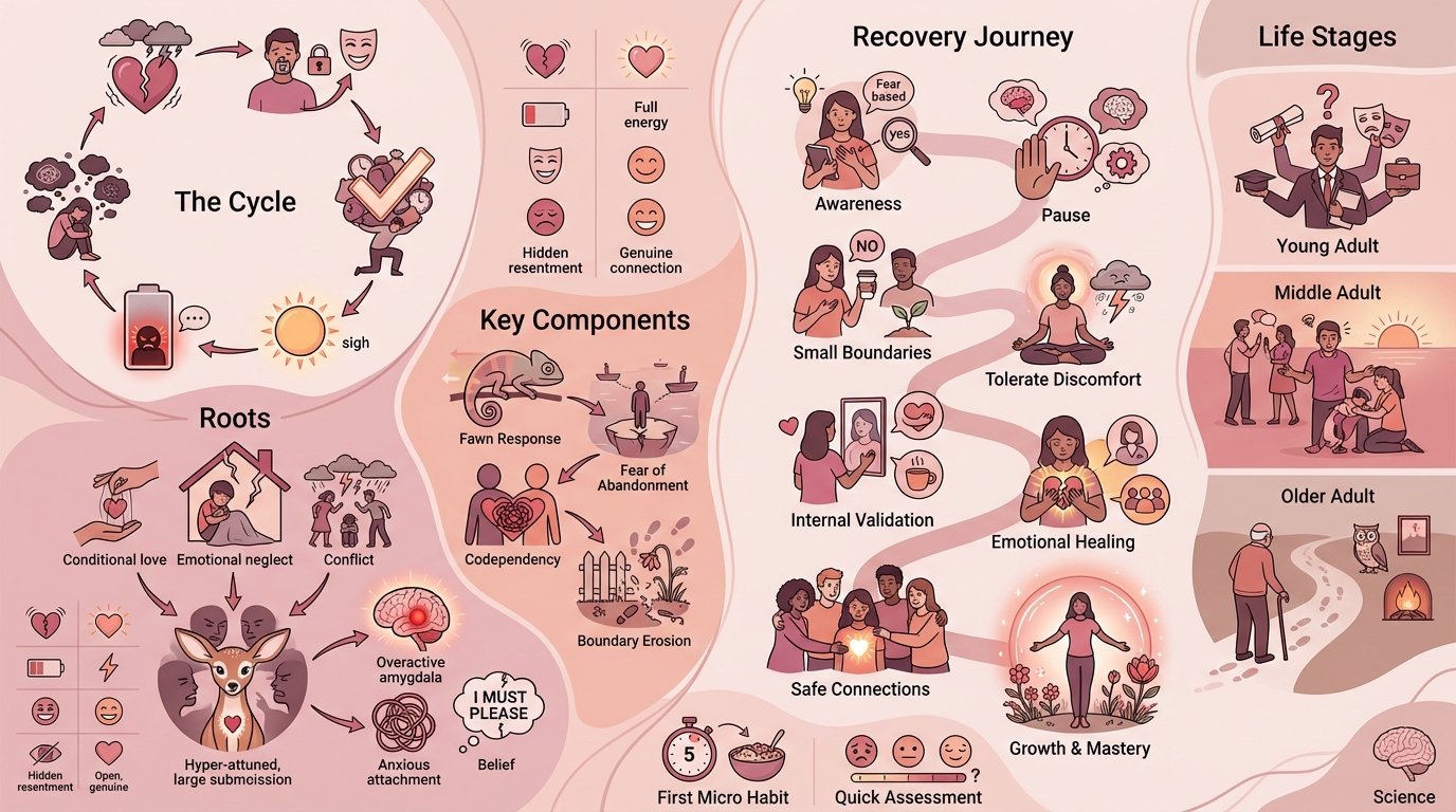 In this guide, you will learn exactly what drives people-pleasing behavior, how it connects to the fawn trauma response, and most importantly, how to break free without becoming unkind or disconnected from the people you love.