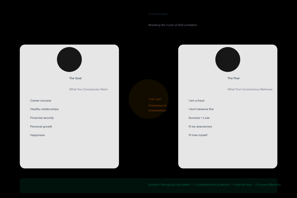 Self-sabotage operates in the gap between your conscious goals and your unconscious beliefs. Consciously, you want success, health, love, and fulfillment. Unconsciously, you may hold beliefs that these things are dangerous, undeserved, or impossible. That conflict creates the self-defeating behavior. It's not stupidity or weakness—it's a conflict between two parts of your mind fighting for control.
