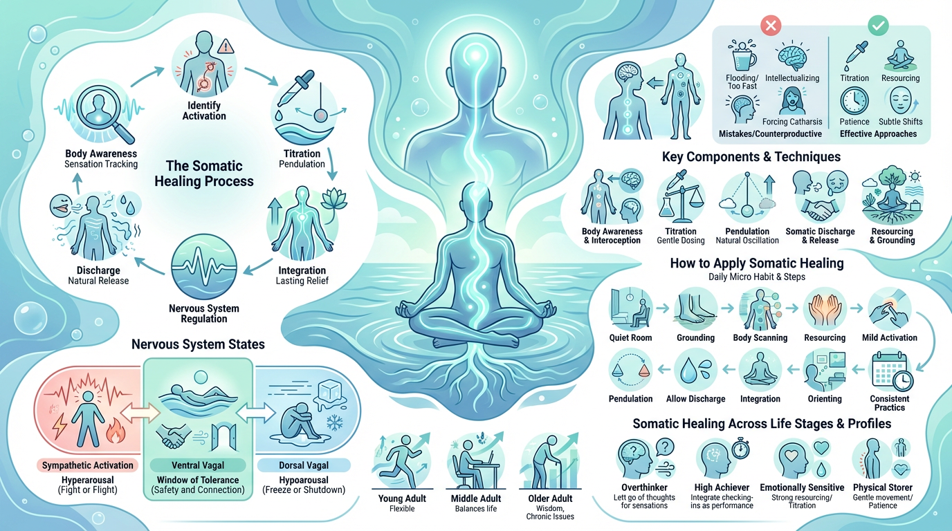 How somatic healing moves from body awareness to nervous system regulation and emotional release.