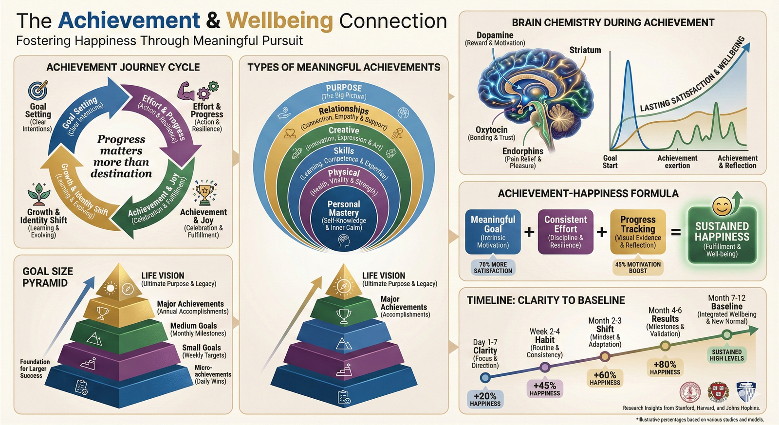 Achievement is the feeling of accomplishment that comes when you reach a meaningful goal. It goes far beyond earning a trophy or receiving recognition. When you complete something important to you, your brain releases powerful chemicals that create deep satisfaction and lasting wellbeing. This fundamental human need drives us forward, shapes our identity, and connects directly to happiness and life satisfaction.