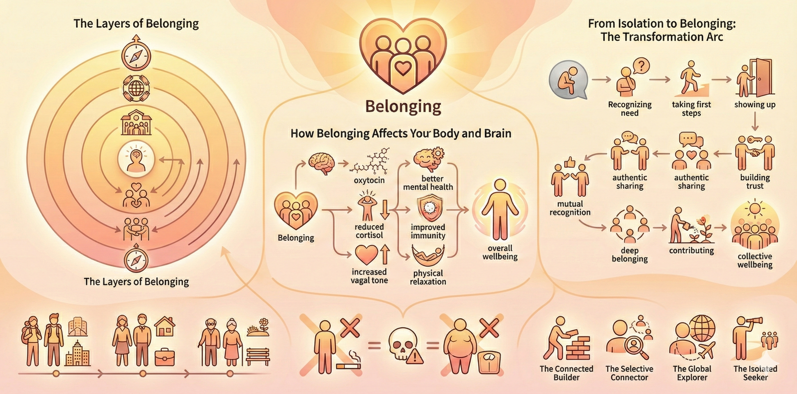 There's a deep human hunger that no amount of success can satisfy—the longing to be truly seen, accepted, and valued. This is belonging. It's the quiet feeling that you matter to others, that there's a place where you fit without pretense. Yet in our hyperconnected world, many feel more isolated than ever. Belonging isn't just about being around people; it's about finding your tribe, those connections where mutual respect and authentic presence transform how we experience life. When you belong, everything shifts—your resilience strengthens, your health improves, and your capacity for joy expands. This guide explores the science of belonging and shows you how to cultivate genuine connection in every part of your life.