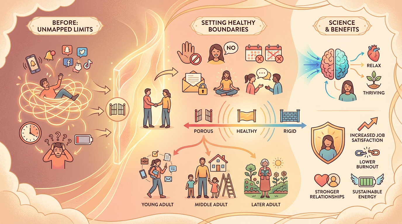 Imagine reaching the end of each day feeling drained, your energy depleted by endless demands from work, family, and friends. You say yes to everything, help everyone, and prioritize others' needs over your own. This exhaustion isn't a personal failing—it's a sign that your boundaries need attention. Boundary setting is the practice of establishing clear limits on what you will and won't do, creating psychological and emotional protection for your wellbeing. In 2026, as remote work blurs the lines between professional and personal time, as social media demands constant availability, and as compassion fatigue spreads across caring professions, healthy boundaries have become essential to happiness and mental health. This guide explores what boundaries are, why they matter, and how to establish them in every area of your life.