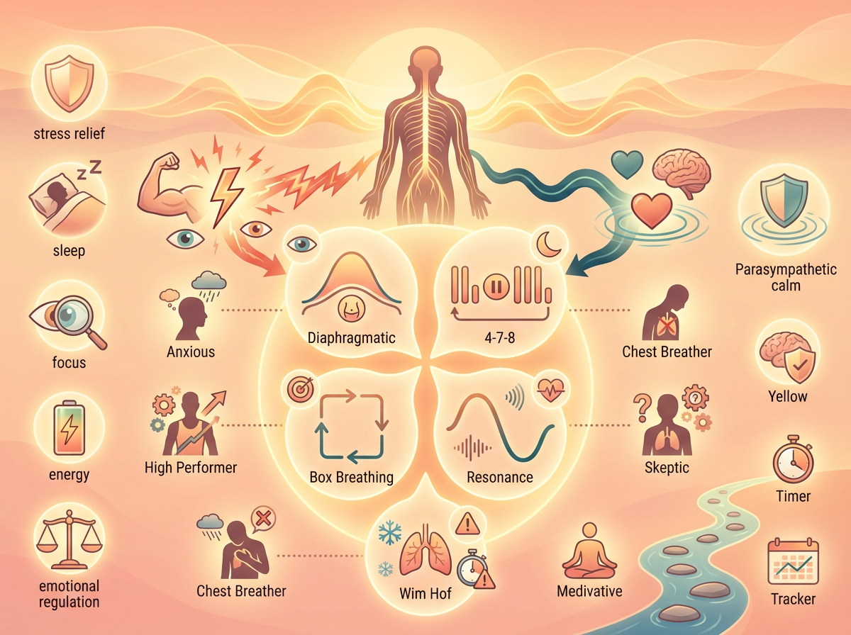 Start with diaphragmatic belly breathing as foundation. Add the physiological sigh for immediate stress relief. Then add 4-7-8 or box breathing based on your primary goals.