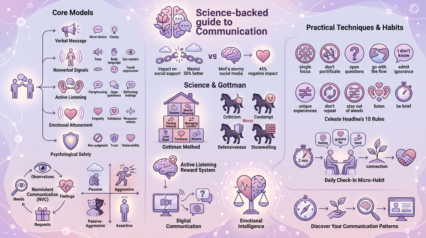 This guide covers what communication actually is, the neuroscience and psychology behind why it matters, and practical evidence-based techniques you can start using today. You will learn methods from Nonviolent Communication (NVC), active listening research, assertiveness training, and the Gottman Method—all backed by decades of scientific study.