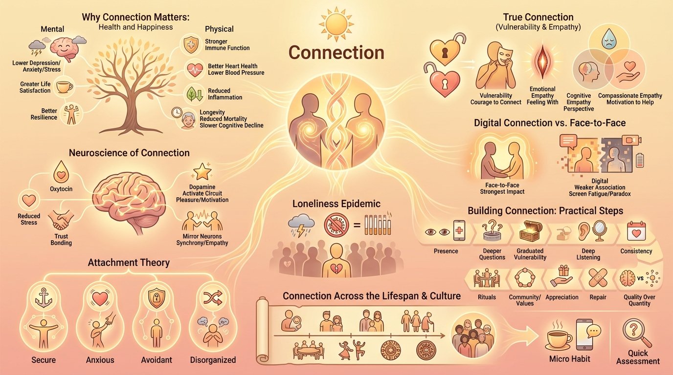 The evidence supporting connection's importance for health and happiness comes from rigorous long-term research across multiple disciplines including psychology, neuroscience, public health, and sociology.
