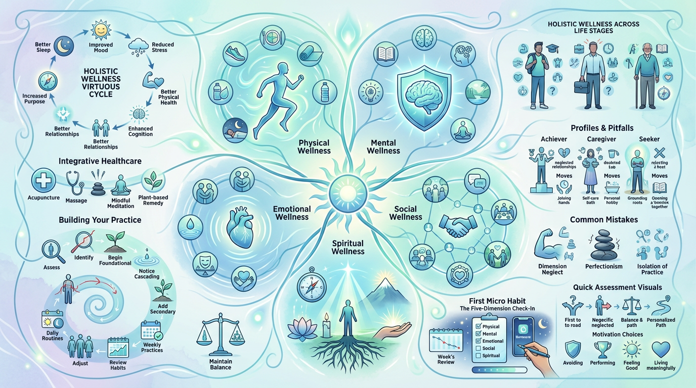Holistic wellness is not about doing more but integrating what you do. The five-dimension check-in micro habit creates awareness that guides action. Start there to identify your priority area.