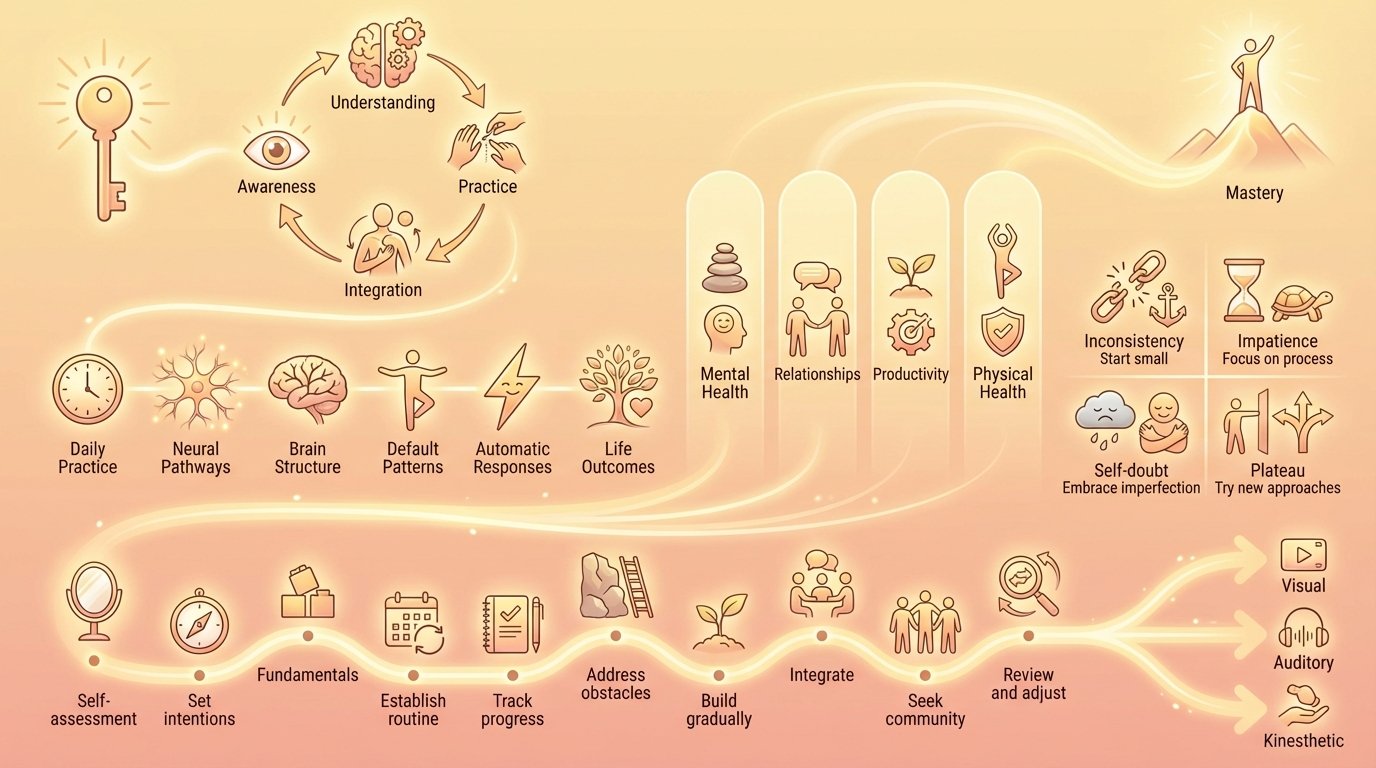 Consider your learning style: visual learners benefit from diagrams and visualization; auditory learners from guided content; kinesthetic learners from physical practices and experiential exercises.