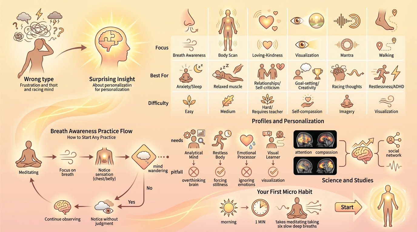 What if the perfect meditation practice for your personality exists and science can now help you find it? This guide covers every major technique with current research. Later sections reveal how different brain types respond to different practices and why most beginners quit before finding their match.