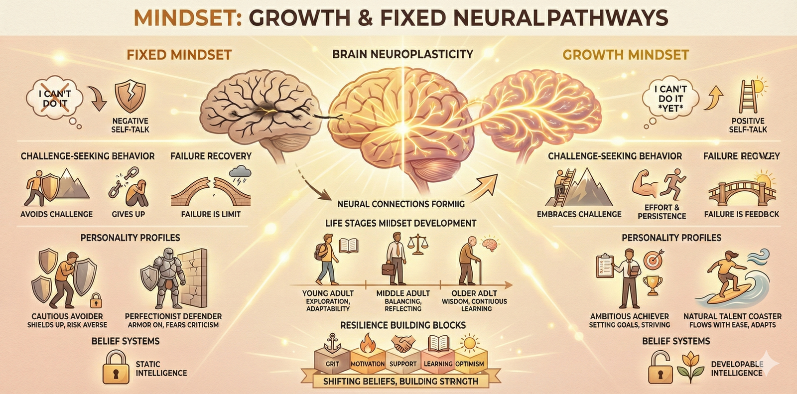 Later adulthood brings changes that challenge fixed mindset people deeply: retirement transitions, changing social roles, physical changes. But a growth mindset thrives in this stage because it embraces change as opportunity for learning. People with growth mindsets approach later adulthood as a new chapter of development. They learn new hobbies, deepen relationships, volunteer in meaningful ways, mentor others, and continue growing mentally and emotionally. Research shows that older adults with growth mindsets report higher life satisfaction, better cognitive health, and more resilience in facing the challenges that come with aging. Your mindset becomes increasingly important as the years add up.