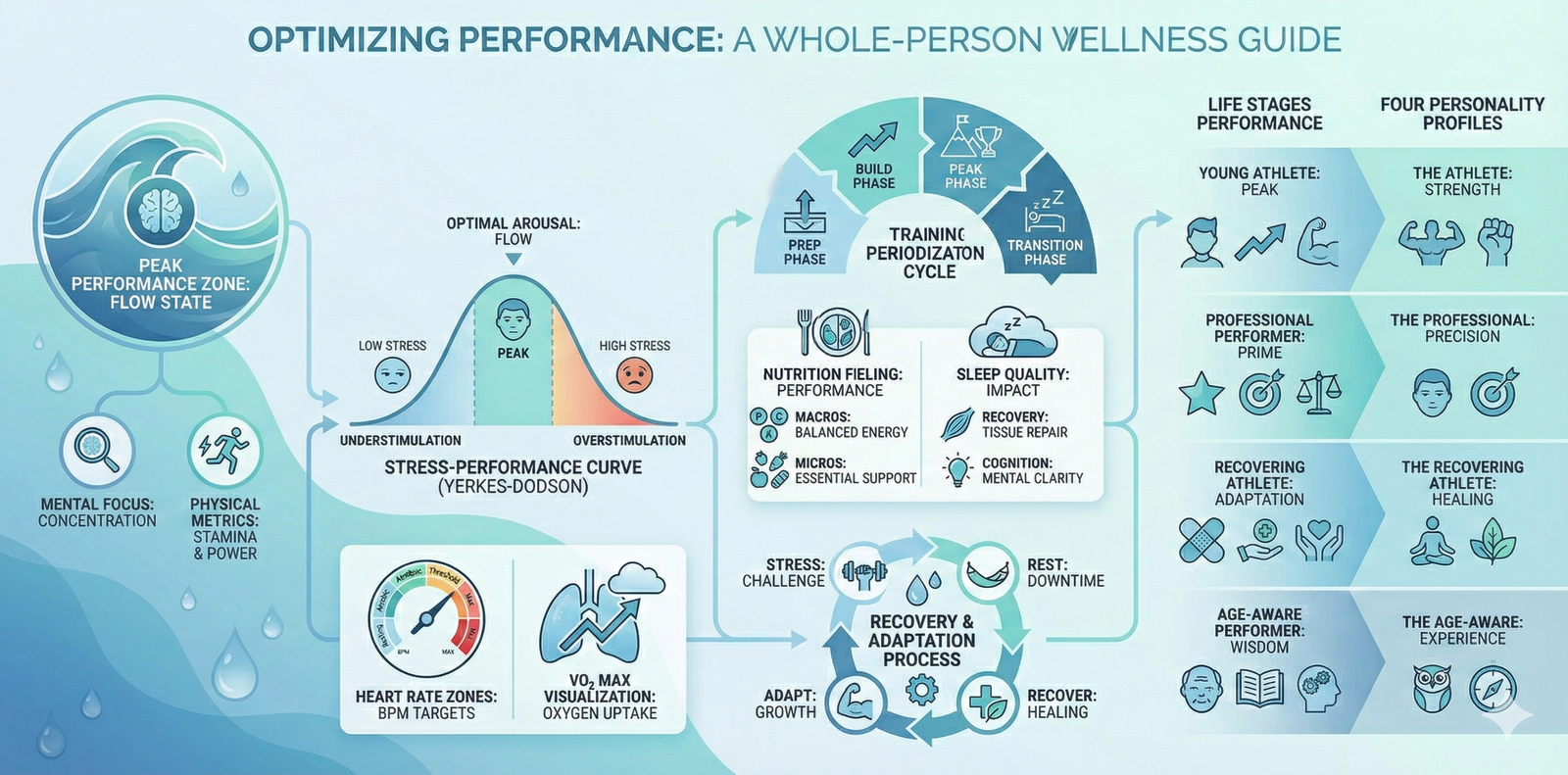 Performance is your ability to consistently execute at your highest level—physically and mentally—under pressure and fatigue. It's the difference between going through the motions and achieving excellence. Whether you're training for athletic competition, managing a demanding career, or pushing through creative work, performance optimization determines your results. Most people operate at 40-60% of their true capacity, leaving enormous untapped potential. The science of performance reveals that small, systematic improvements in training, recovery, mental focus, and physiological management can unlock dramatic gains. Elite athletes, high-performing professionals, and exceptional students don't rely on talent alone—they master the principles of peak performance: understanding their body's adaptation processes, managing arousal and focus states, recovering strategically, and developing unshakeable mental resilience.