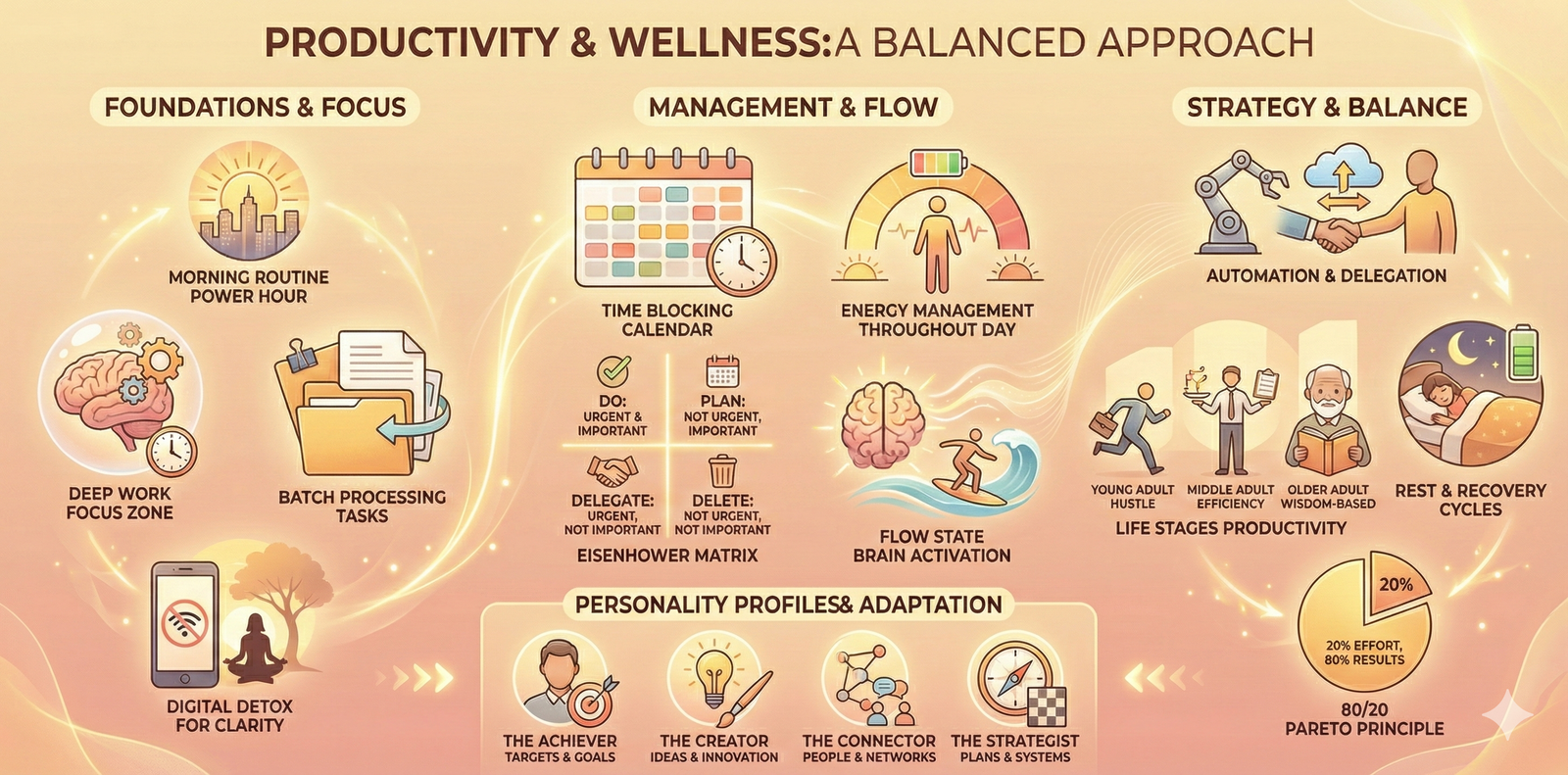 Imagine completing your hardest work by noon, feeling energized rather than exhausted. Picture yourself entering a state of complete focus where time disappears and creativity flows. That's not fantasy—that's productivity aligned with wellbeing.