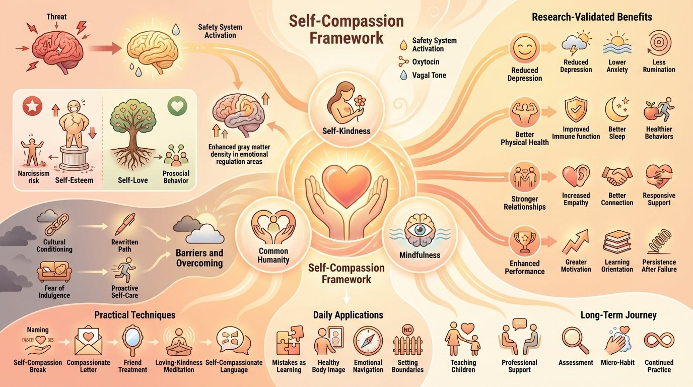 Consider related practices including mindfulness for the awareness component of self-compassion, meditation practices for formal training, and self-care practices for translating self-love into concrete actions. Understanding emotional intelligence and mental resilience shows how self-compassion strengthens these crucial capacities.