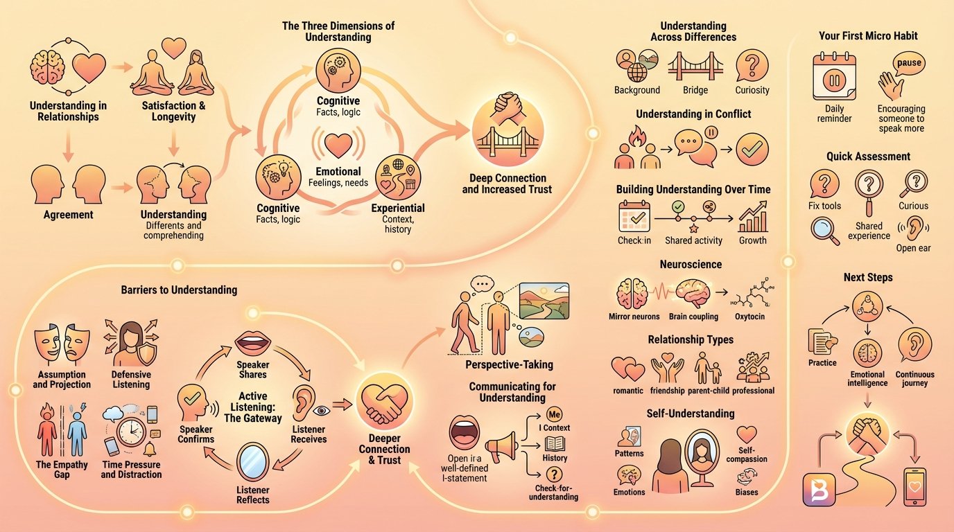 Research shows that understanding forms the foundation of healthy relationships. Studies from the Gottman Institute indicate that couples who demonstrate high levels of mutual understanding report significantly greater relationship satisfaction and longevity. Yet many people confuse understanding with agreement, missing the subtle but crucial distinction.