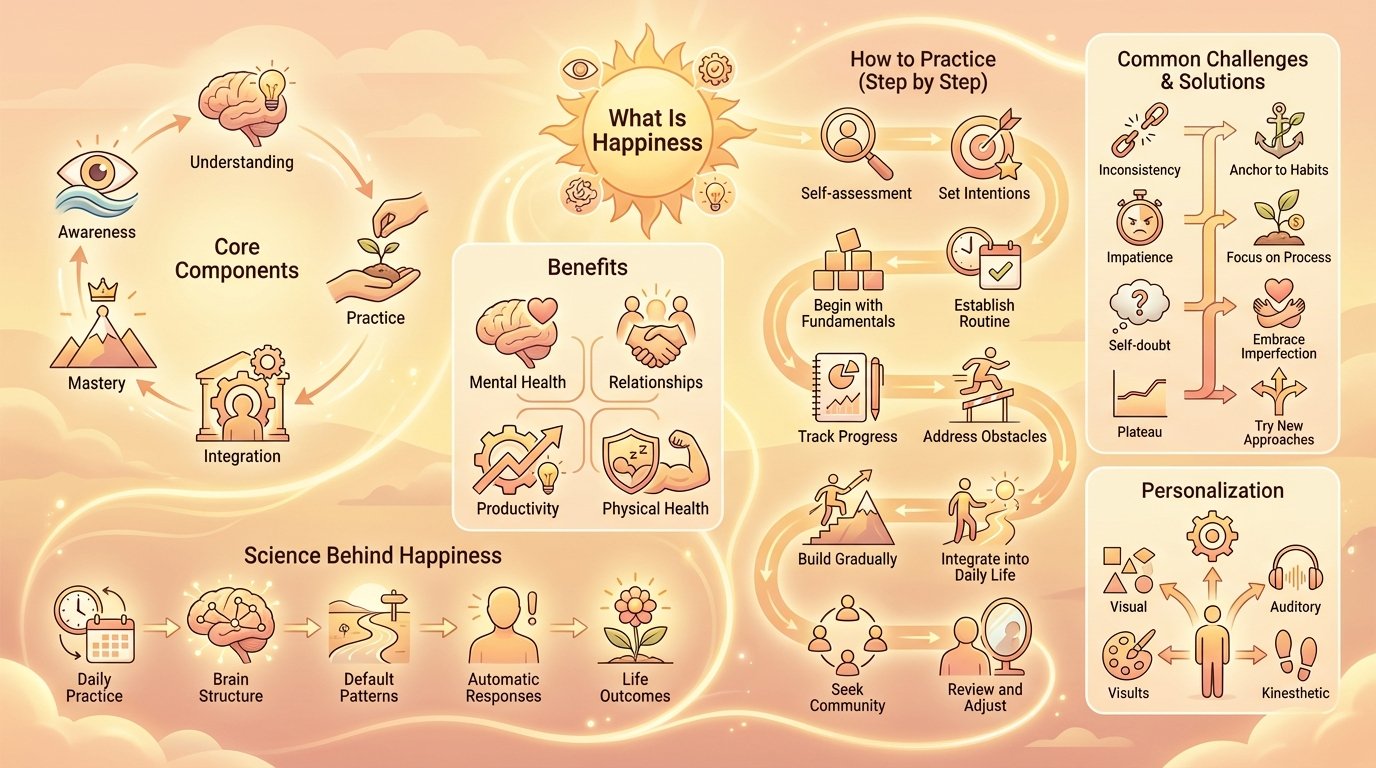 Understanding what happiness is becomes real only when you apply it. Start with the micro habit above—three good things nightly for a week. Observe what you notice. Happiness isn't found; it's built through small, consistent, deliberate choices. The good news is that you don't need dramatic life changes. You need to be intentional and specific about where you focus your energy and attention.